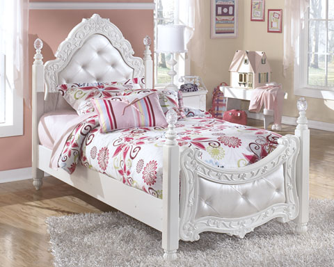 OverviewInspired by French provincial style, the Exquisite twin poster headboard/footboard is perfect for la petite mademoiselle. Embossed with a decorative motif of rosettes and appliques, the detailed framework is beautiful in every way. Satiny tufted upholstery is a dream come true! • Made of engineered wood • Tufted design with faux crystal accents • Faux crystal finials • Ornate bun feet