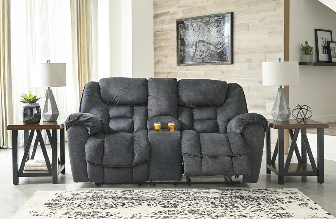OverviewSometimes seeing is believing. Rest assured the Capehorn reclining loveseat with console is every bit as indulgent as it looks. Designed to put you in the lap of luxury, this generously scaled reclining sofa—wrapped in a wonderfully plush and practical granite gray upholstery—sports scooped pillow wrapped armrests and curvaceously cushioned head-neck support for feel-good flair. • Dual-sided recliner • Pull tab reclining motion • Lift-top storage console and 2 cup holders • Corner-blocked frame with metal reinforced seat • Attached back and seat cushions • High-resiliency foam cushions wrapped in thick poly fiber • Polyester upholstery